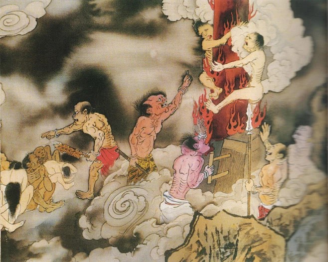 在《普贤上师言教》中有邪淫者在地狱受苦情形的描述。因为猛业成熟,变现出地狱铁柱山的业力景象,在业力的牵引下,淫欲众生身不由己地来到铁柱山下,这时听到山上昔日的爱友呼唤自己,于是就向山顶攀登,山上的铁树枝叶纷纷向下刺穿身体。等到达山顶时,又有乌鸦、鹰鹫等飞来啄食他们的眼油。此时,山下传来呼唤声,淫欲众生又如前一样奔下山去,而所有的铁树枝叶又指向上方,从他们的前胸径直刺入穿透后背。到了山脚下,可怖的铁男、铁女拥抱其身,将他们的头吞入口中大嚼,嘴角两边流出白色的脑浆,淫欲众生异常痛苦。