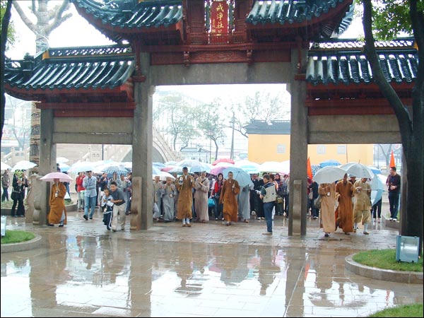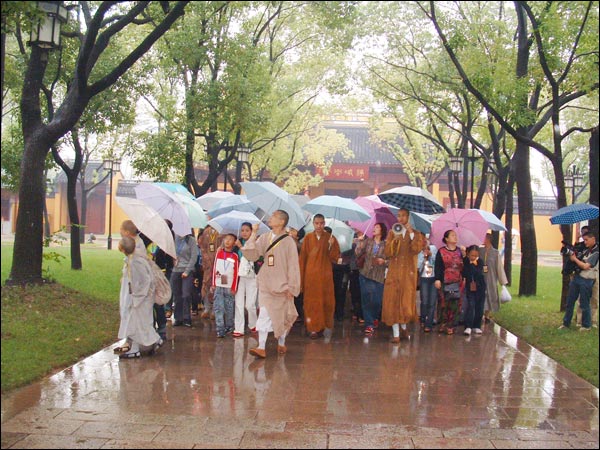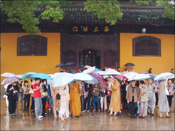 戒幢佛学研究所观云法师和成峰法师在山门外迎接参访团一行,随后,带领大众至各殿堂一一参礼。成峰法师如法详尽而不失幽默的介绍,不时赢得大众的掌声。