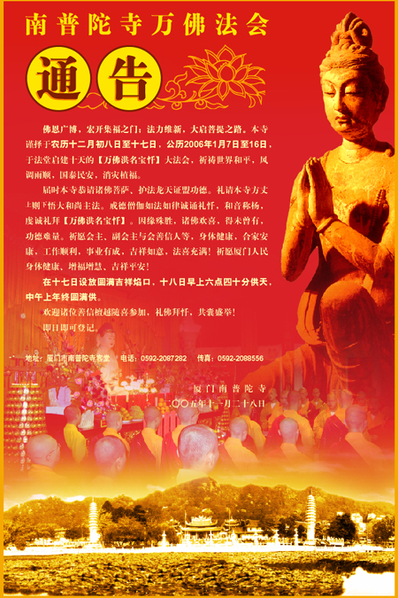 届时本寺恭庆诸佛菩萨,护法龙天证盟功德。礼请本寺方丈上则下悟大和尚主法。戒德僧伽如法如律诚诵礼忏,和音称杨,虔诚礼拜【万佛洪名宝忏】。因缘殊胜,诸佛欢喜,得未曾有,功德难量。祈愿会主、副会主与会善人等,身体健康,合家安康,工作顺利,事业有成,吉祥如意,法喜充满!祈愿厦门人民身体健康、增福增慧、吉祥平安!