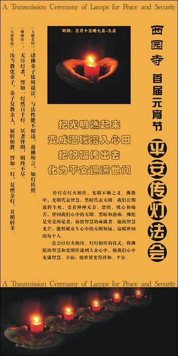 苏州西园寺将于农历新年元宵举行“首届平安传灯法会”,预期法会将以灯火相传,灯灯相传的仪式,将佛陀的智慧和光明传递到大众心中,使大家心中充满智慧、幸福;使世界变得祥和,平安。