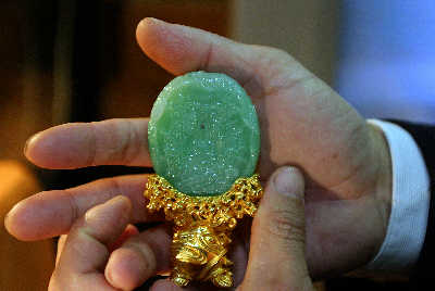 据了解,《千手观音》的材质为缅甸进口的阳绿色翡翠,市价在15万元人民币左右,而在雕成微雕《千手观音》后,身价则难以估量。(记者:俞凯)