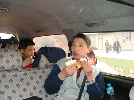 行脚团一上午走了23km,这几天路过及接下来要行脚的路都属于大别山区的山路,今天行脚的路长、险,一直走到12:30才走到。在去用午餐的车上,行脚团员们疲乏的都闭上眼睛靠着可靠的车窗、座背、拉着车安全把手入睡状态了,艾师傅还用手护着用来与路人结缘的水果糖包包;因为这段路是盘山路,10km的路180度急转弯的路就有7、8个,车子开起来晃得厉害;他们每个人看上去都睡的很香。