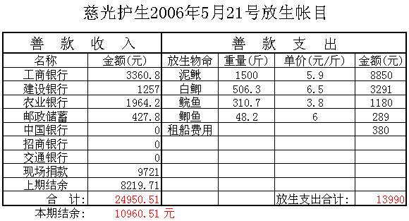 4月份结余放生善款为:11219.71元-3000元=8219.71元