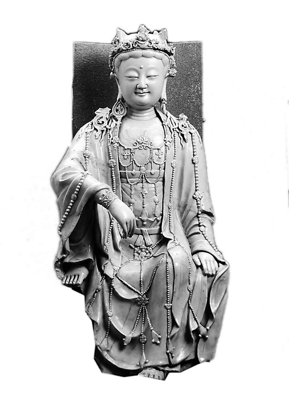 这件瓷塑像高67厘米,1955年出土于西城区定阜大街西口。菩萨像头戴宝冠,宝冠上有小化佛,已残。额头宽阔,双目微闭,端庄慈祥,气质高雅。右腿支起,左腿下垂,右臂放在右膝上,神态优美,这种姿势的观音一般称为水月观音。观音上身穿袈裟,下身着长裙,胸前及衣裙上饰联珠璎珞,手腕戴臂钏,全身装饰十分繁缛。通体施青白釉,釉色白中泛青,胎质洁白细腻。