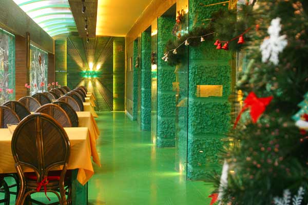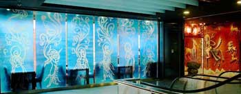 [﹡﹡报讯] 经过近半年努力,荷塘月色素食在北京市中关村第三极文化中心成功开辟了第二家分店,于2006年7月8日上午十一时隆重举行开业庆典,庆典活动由来自国内知名寺院及佛学院的宗教界人士主持。文化界、企业界、及佛教界三百余人参加。荷塘月色是一家风格独具的素食餐厅,在这里,人们不仅可以享受到新鲜可口的美食,还可以欣赏一道道令人惊叹的艺术风景线。六块绚丽的蔚蓝色玻璃壁画顶天立地,以北魏风格绘制的六位菩萨神态各异,身姿婀娜地迎接着人们的注目;正门入口处是一幅生动的九色鹿浮雕,取材于著名的敦煌经变;特别订制的水泥砖地面上,清晰可辩二首意境清新高远的禅诗;吧台的背景墙面是代表荷塘月色统一风格的设计组合。中间是一轮光芒四射的满月,两侧有八块张大千手绘神采飞扬的飞天玻璃浮雕;吧台上方吊顶采用自在手印图案,宣示着一种解脱精神——心灵超越与文化包容;纯木制的天花吊顶借鉴了西方教堂建筑注重心灵关怀的设计理念,以光线与色彩的巧妙运用,营造出使人身心放松,豁然开朗的自由空间;在富于文化内涵的地面与自由开朗的天花之间,是古拙厚重的中心立柱,金色的莲花底座托起造型别致新颖的柱体,四盏明莹的壁灯仿佛空中天女随手洒落的花瓣;造型简约,风格浪漫的餐桌上,兰花柔缓地绽放;从玻璃幕墙上垂挂下的酒红色窗纱跳跃出灵动和谐的音乐节拍,与窗外夕阳下教堂传送的晚钟宫商酬唱,演绎着传承远古精神、融合东西文化的经典乐章。
