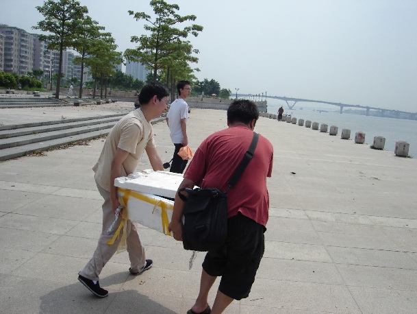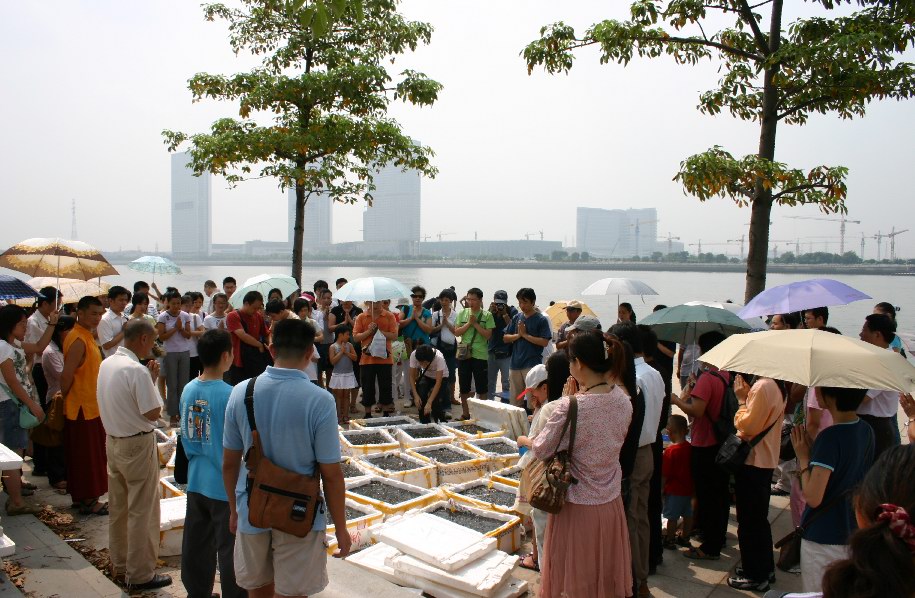 放生仪轨还没有开始,我们看到一些鲤鱼,生命力不是太强,几位师兄马上把鲤鱼先抬去放生了,一边念佛,一般放入珠江。看到鲤鱼恢复自由,几位女师兄流下了眼泪。