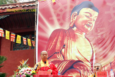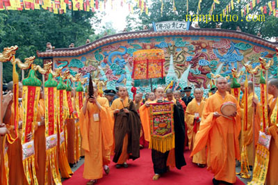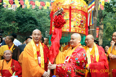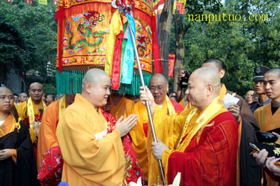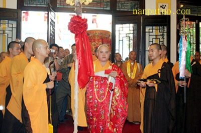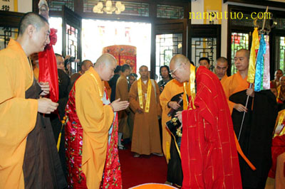 8时30分升座仪式开始,心照法师从寺外向寺中徐行,闽南佛学院学僧组成仪仗队护持于两侧,圣辉法师等诸位大德长老护送在后。一路艳阳高照,彩旗飘飘。“南无本师释迦牟尼佛”圣号相伴,佛乐梵呗、掌声、赞叹声不绝于耳,声声传达着高僧掘起之喜悦和佛教的希望。从三门殿、观音殿、大雄宝殿、法堂到方丈室入座,一一如法进行。心照法师于法堂宣誓:“将此身心奉尘刹,是则名为报佛恩!”接着入室登法王座,圣辉法师为心照法师送座。