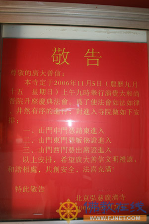 北京广济寺将于2006年11月5日(农历九月十五)上午九时举行演觉法师晋院升座庆典法会。