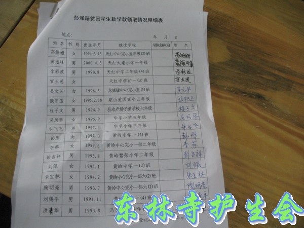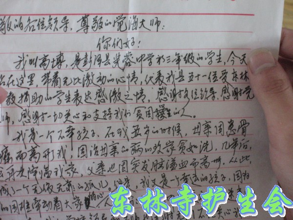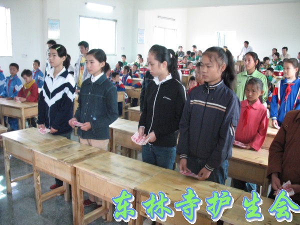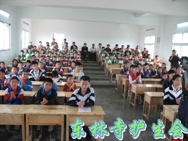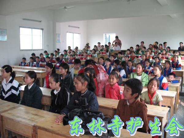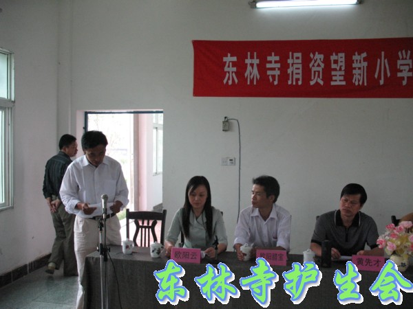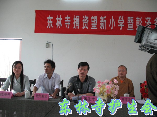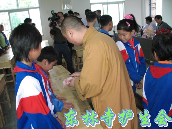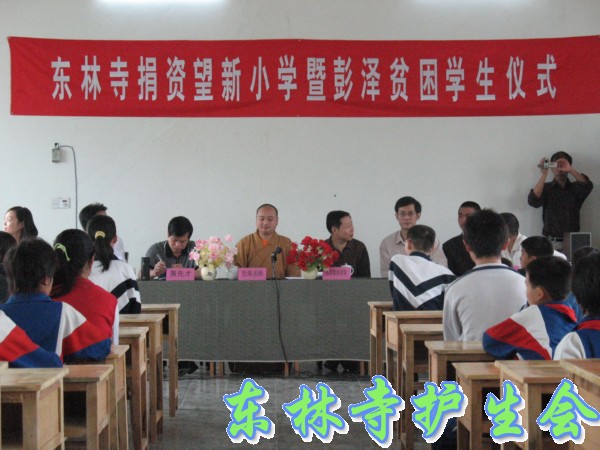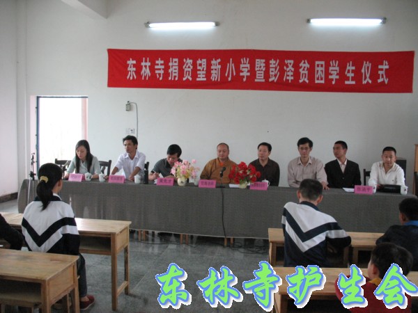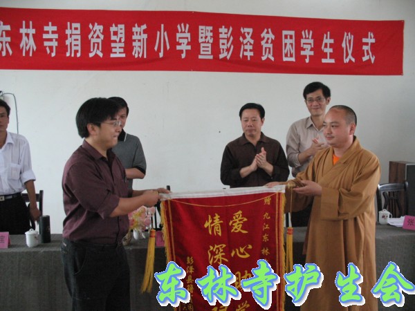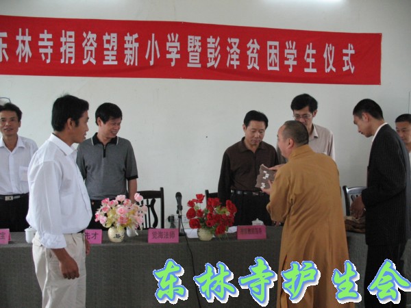 仪式现场由觉海法师个人向彭泽县望新村小学捐赠建校资金10万,由望新村委书记代表接受捐赠;另有护生会1万7千元现场亲手发给彭泽县下属各个学校的贫困生,每人300元,他们其中有父母双亡的、父母有残疾的、父母有重病的、家庭困难的共计50余人。觉海法师开示学生们要好好学习,好好做人,将来报孝祖国,报孝社会……彭泽县委副书记黄才先在会上说非常感谢东林寺的这种善举……彭泽县团委书记欧阳云对学生们讲,大家一定要好好学习才能回报觉海法师,以后大家还要给觉海法师写信,汇报自己的学习情况,并将自己的成绩告诉觉海法师。现场掌声不断。