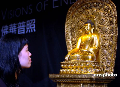 资料图:苏富比于10月7日在香港举行中国瓷器及工艺品秋季拍卖会﹐有210件文物拍卖﹐总价值预计高达5亿元港币。9月4日该公司向新闻界展示部分即将拍卖的文物精品。--“佛华普照”为明初重要鎏金铜像。 中新社发 宋吉河 摄