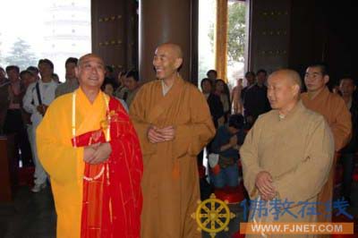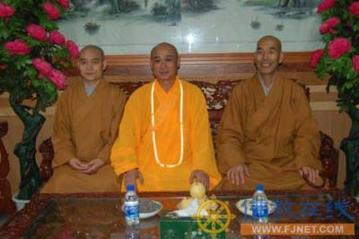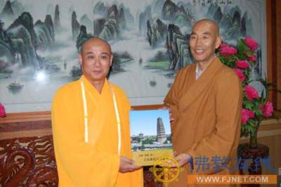 智超法师(右一)、贤空法师(左一)在接待室欢迎宏满法师一行