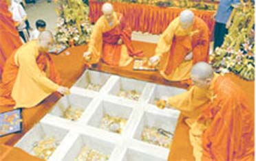 据了解,有许许多多的善男信女,纷纷涌到桥南路的佛牙寺奉献宝物,包括宝石、金与银币等,全数交出,不止如此,在这间造价上亿令吉(约六千三百万余美元以上)的佛牙寺内,就连寺里的佛像、地上的一砖、屋顶的一瓦和天花板,也由信众慷慨认捐。
