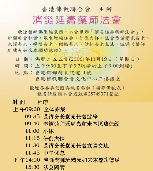 据香港佛教联合会报道:恰逢药师佛诞来临,香港佛教联合会将于2006年11月19日,在香港佛教联合会文化中心三楼礼堂举办“消灾延寿药师法会”。法会将恭请觉光法师、永惺法师、畅怀法师、绍根法师、剑钊法师主法,讽诵《药师刘琉璃光如来本愿功德经》以祈愿社会和谐、众生增福延寿、如意吉祥。