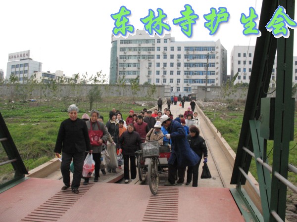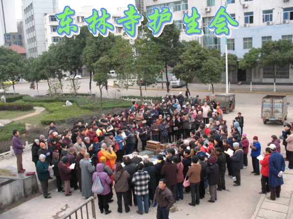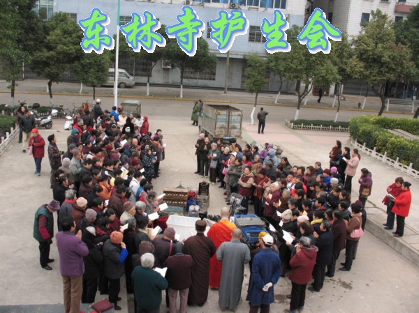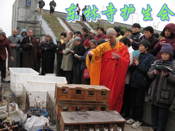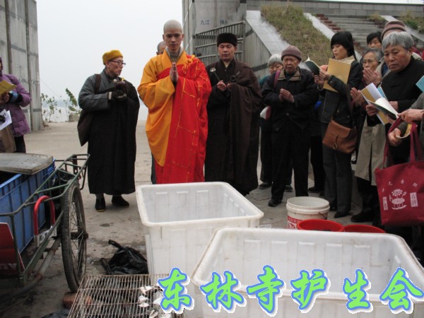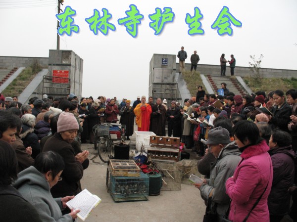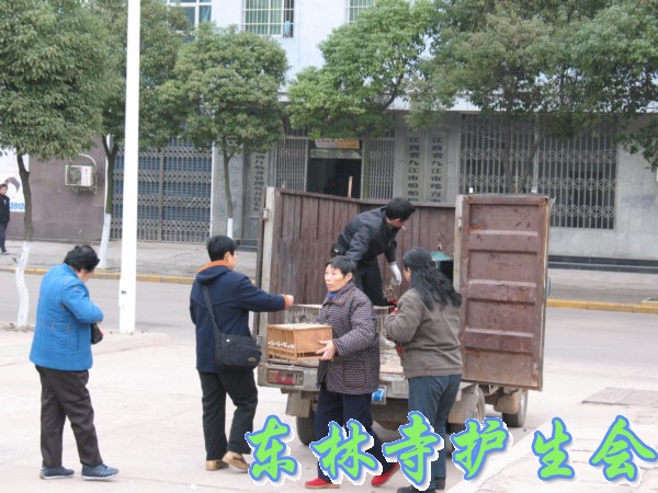2006年12月3日,是世界残疾人日。因此,九江念佛堂12月4日在长江举行放生活动,九江众居士大约300多人参加,迎请东林寺护生会的法师主法。现在九江的天气虽然很冷,然而参加放生的四众弟子依然很多,大家早早地就买好了在长江码头等候法师的到来,8点钟,放生仪式正式开始,由护生会心开法师主法。被放的众生鸟类有麻雀、画眉、八哥、斑鸠、喜鹊,等;水产类有乌鱼、黄鳝、泥鳅、乌龟、甲鱼、鲫鱼、鲤鱼等。