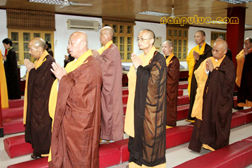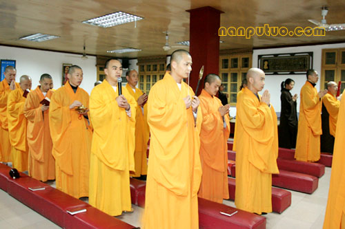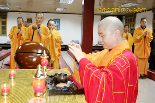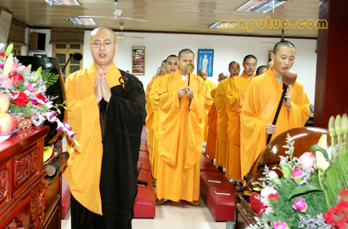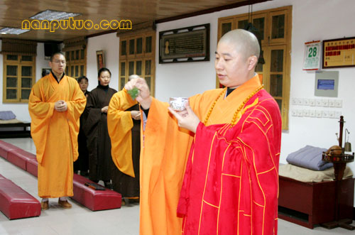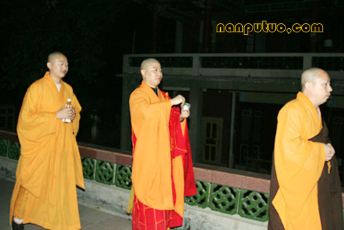 12月28日(农历十一月初九)晚七时许,南普陀念佛堂冬季佛七举行洒净仪式。念佛堂僧值永缘法师领居士代表,持香、花至方丈室迎请和尚前往念佛堂主法。
