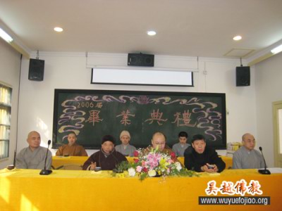 据吴越佛教报道:1月25日上午9时30分,杭州佛学院2006届毕业典礼在佛学院多媒体教室隆重举行。出席典礼的有省市民宗委与佛协领导,兄弟寺院的住持,校内的法师、老师及学僧。典礼由杭州佛学院教务主任刚晓法师主持并致辞。