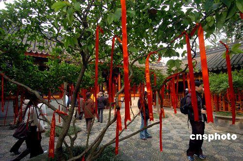 | 中国著名古剎苏州寒山寺﹐2006年岁末香火旺盛﹐游人们以在树上系红布条系的方式,辞旧迎新,祝福新年红运当头。 |