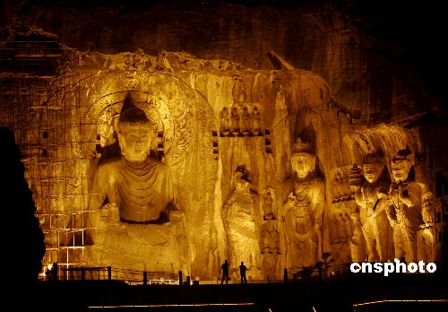 4月1日晚,洛阳龙门石窟奉先寺亮化工程在进行试灯调试。游人在4月7日后即可“夜游龙门”。当晚,龙门石窟整体亮化工程全部2886个灯具、5370米灯带同时接通点亮,延绵1公里的龙门西山2000个窟龛、10万尊石佛在现代灯光的辉映下首次在夜色中展现在人们面前。 经国家文物局批准,洛阳龙门石窟经过3年的规划、论证、设计和施工,投资800万元,对奉先寺等11个重点洞窟运用各种现代照明形式,立体塑造夜间佛像表情生动、造型各异的神采;对其它小洞窟进行灯光修饰使其亮度辐射到整个山体,营造出比日间自然景观更具有古典艺术气息和神秘色彩的别致氛围,使中国的佛教文化在夜间大放异彩。