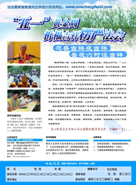 2007年5月1日~6日,北京龙泉寺将举办“五一”黄金周祈福吉祥楞严法会,共同读诵有“开悟楞严”自称的大乘经典《大佛顶首楞严经》,以期开启大众内在的智慧;并祈请中国佛教协会副会长兼秘书长、龙泉寺方丈学诚法师为大家做系列佛法开示,引导大众顺利进入佛法的殿堂。