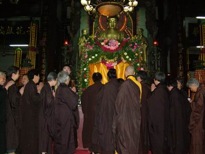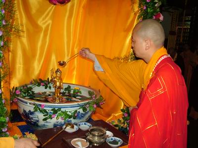 八点整四众弟子在大雄宝殿前整齐列队,高唱释迦牟尼佛圣号。释迦牟尼太子在香花、幢幡、宝盖及钟鼓齐鸣、梵贝清悠的氛围中,从金佛广场大金佛前恭迎至大雄宝殿。在恭迎的过程中,天空突现瑞象,本是下着大雨,但恭迎队伍一出大雄宝殿,雨便停下了,使此次殊胜的法会更加庄严。随后四众弟子们在佛前忏悔发愿,同赞佛陀功德,并排成整齐的队伍依次用香汤功德水为释迦牟尼太子沐浴,虔诚地体会“香汤浴佛身法水净吾心”的真义,场面殊胜、庄严感人。