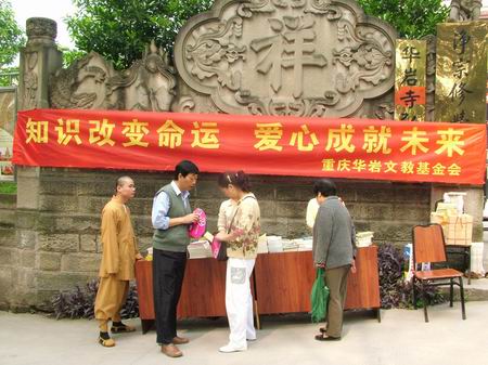 五一国际劳动节的清晨,华岩寺弘法楼前挂上了慈善活动的大横幅