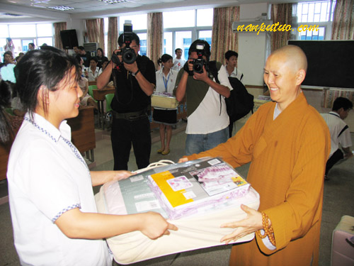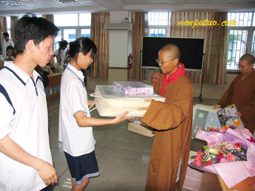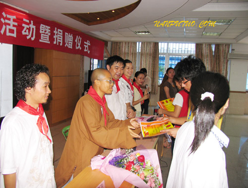 5月31日下午,遵照南普陀寺慈善会会长圣辉大和尚的指示,普陀、德鸣、天真三位法师来到厦门市特殊教育学校慰问,为241名学生送去春秋被每人各一套,合计人民币46000元,作为孩子们的节日礼物。普陀法师代表圣辉大和尚,祝特教学校的儿童与健康儿童一样,过上一个丰富多彩的节日、健康地成长!