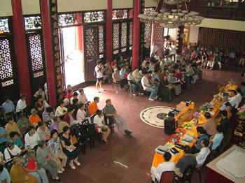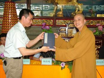 上午十时,在重庆市佛教协会顾问钟鸿鸣老居士(曾为华岩寺监院,协助钟镜法师撰修及雕刻《华岩寺志》,文革被迫还俗)主持下,《华岩寺志》重刻工程竣工新闻发布会暨赠书仪式正式开始,道坚法师和吴实在副主任分别作重要讲话。道坚法师在讲话中表示,启动重刻《华岩寺志》工程,是华岩寺传承中国传统文化的一部分,具有重大意义。并依次介绍华岩寺正在进行的古建筑文物保护工程,对《华岩寺志》中的40多个古碑文复刻工程,对包括文物书画修复在内的文献资料抢救工程等,力求通过这些工程的实施,再现华岩寺昔日的人文精神。吴主任在讲话中强调,华岩寺在我市率先启动重刻《华岩寺志》等系列文化工程,对挖掘和保护我市佛教历史文化遗产有重大意义,可谓功德无量!