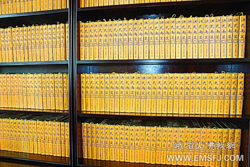 峨眉山佛教图书馆按照目前高等院校图书馆的建馆方法建设。佛教图书馆集资料、教育、宣传于一体,所藏图书分社会科学类、佛经类等,均按照我国国家图书分类法进行分类,其中,佛教图书按照北京大学白化文教授的佛教图书分类法进行分类。目前,刚建起的图书馆便存有各类图书及音像资料25000多册,其中,内藏有《四库全书》、《永乐大典》等珍贵典籍。