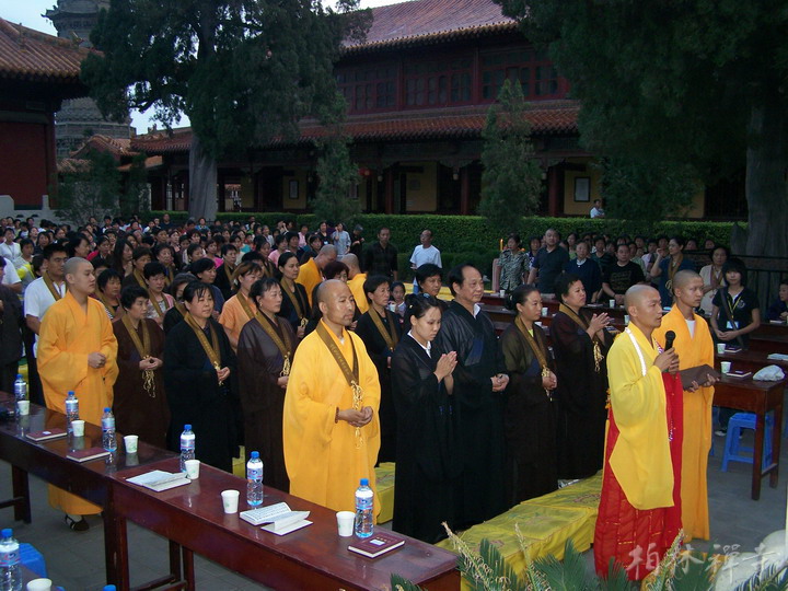 8月27日(农历七月十五),是为期三月的僧团结夏安居结束之日,同时这天也是佛教传统节日盂兰盆节。早斋后,在普光明殿进行了自恣仪式,僧众一一对首羯磨。上午在万佛楼举行盂兰盆供,以此供养僧团的功德为过去世的父母回向,愿他们脱离三恶道、究竟解脱。中午在万佛楼,明海法师为数百位信众传授三皈五戒。晚上,在观音殿前施放了瑜伽焰口。中元节报恩法会至此圆满结束。