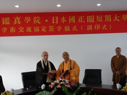 日本友人在学院常务副院长能修和副院长殷炳健的陪同下,考察了大明寺、鉴真学院,对鉴真学院的办学情况作了较高的评价。参观后,在鉴真学院会议室举行了中国鉴真学院与日本正眼短期大学学术交流协定和互派留学生协议书签字仪式。鉴真学院能修常务副院长和山川宗玄校长分别在协定书上签字,并发表了热情洋溢的讲话,还互赠了礼品。至此,鉴真学院与日本正眼大学正式结为兄弟院校。
