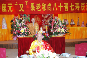 10月1日是光孝寺座元又果法师的八十晋七寿辰,光孝寺僧众及其弟子居士齐聚菩提甘露坊举行寿辰斋宴。寿辰斋宴中光孝寺方丈明生法师做代表向又果法师祝寿。
