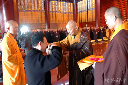 14日上午,净慧老和尚在万佛楼为陈云君先生上堂说法,正在柏林禅寺参加传授三坛大戒法会的二百余名新戒沙弥也一起参加了仪式。(消息来临:柏林禅寺)