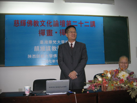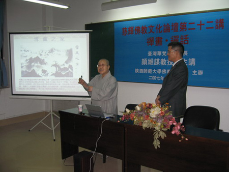 10月18日,慈辉佛教文化论坛第二十二讲,在陕西师范大学长安校区文渊楼文学院研究生教室举办。中国台湾省华梵大学校长颜维谋教授应邀作《禅画·禅话》讲座。台湾省华梵大学前任校长马逊教授(隆迅法师)参予了互动,陕西师范大学宗教中心主任吕建福教授担任点评嘉宾。讲座由陕西师范大学佛教所所长吴言生教授主持。