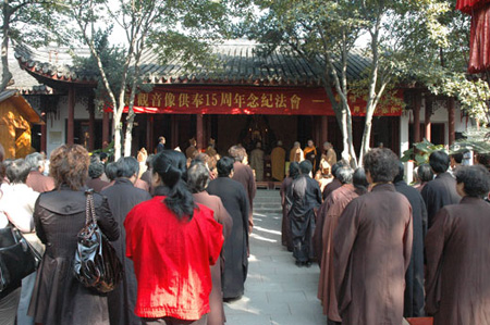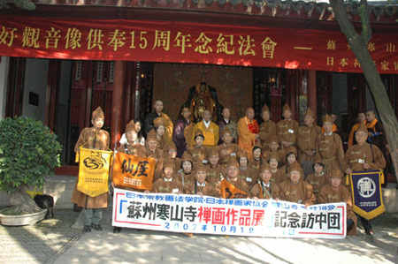 10月20日上午,寒山寺隆重举行“中日友好观音像供奉15周年纪念法会”暨“禅意寒山·日本禅画邀请展”开幕仪式。苏州市政协副主席金明及市有关部门领导,寒山寺法主性空法师、方丈秋爽法师,日本禅画家协会会长平冈嘉卫门先生等100余人参加了揭幕仪式。