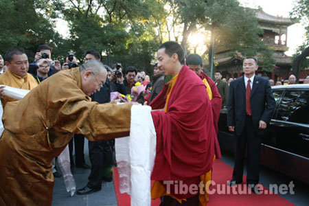 第十一世班禅额尔德尼·确吉杰布10月19日上午在北京雍和宫接受了中国藏语系高级佛学院第三届藏传佛教高级学衔获得者的朝拜。来自西藏、青海、甘肃、四川、云南等各地的高僧大德和有关宗教界人士,中国藏语系高级佛学院师生及雍和宫僧众等600余人参加了朝拜活动。