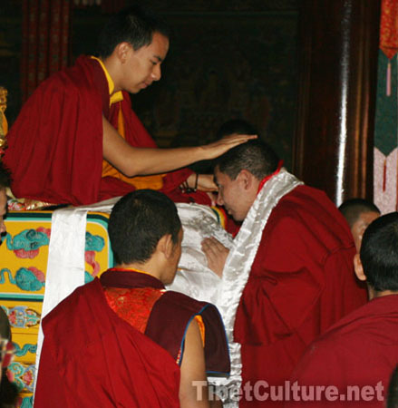 在庄严的法号和乐声中,班禅在法轮殿接受了僧众的朝拜。第三届高级学衔“拓然巴”获得者向班禅敬献了哈达。班禅为僧众摸顶赐福,并赐吉祥护结。