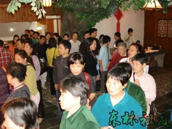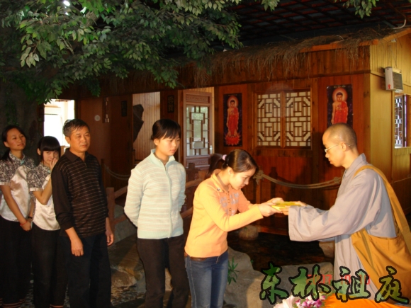 信众们有次序地依次排队入场恭敬领取有法师签名的《净土资粮》光盘。