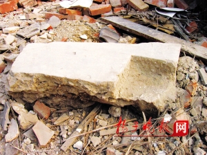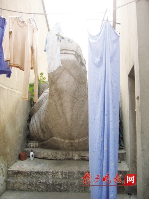 接着记者又一头钻进一片低矮连绵的居民区,好不容易找到了夹在居民家院中的御制左石碑,这片民居还在等待拆迁中,一个不大的院子四面全是住房,在两幢房子中间,看到了一个巨大的石龟,但不见一点碑身的影子,石龟被紧紧地夹在中间,底座上摆着一些居民用的生活品,石龟的头上挂着几件晾晒的衣服。这可是看得见的大报恩寺所剩不多的遗迹之一,实在让人看了心中不是滋味。住在这里的一个老人告诉记者,他们已经在此住了70年,过去这里到处都是散落的大报恩寺遗留的石构件,记者看到现在不少居民家中确实还能看见,有的用来做门槛,有的用来做门枕,其中记者在一民居的墙角处看见一块保存尚好的大型石构件,直径有70厘米。在小巷里也能看到一些石础和石基等构件。