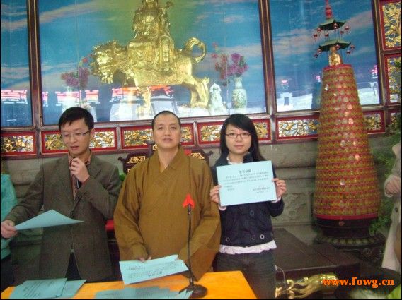 中国佛网(2007年11月25日讯)昨日,由重庆华岩文教基金会理事长,华岩寺方丈道坚法师发起创办,由重庆华岩文教基金会组织的重庆华岩手语培训班第二期培训学员结业仪式在华岩寺弘法楼进行,道坚法师为第二期来自重庆各高校以及各行各业的200多名手语爱好者颁发了手语学习证明并现场给大家开示和回答了大家对佛学知识的提问,道坚法师还观看了学员用手语流畅地表达的学习感想,道坚法师看后非常高兴,肯定了这次培训的效果,说大家学习非常认真并希望大家学习结束后把所学习的手语知识用去帮助那些聋人朋友,给他们提供支持和帮助,会后道坚法师和200名多名学员合影留念!