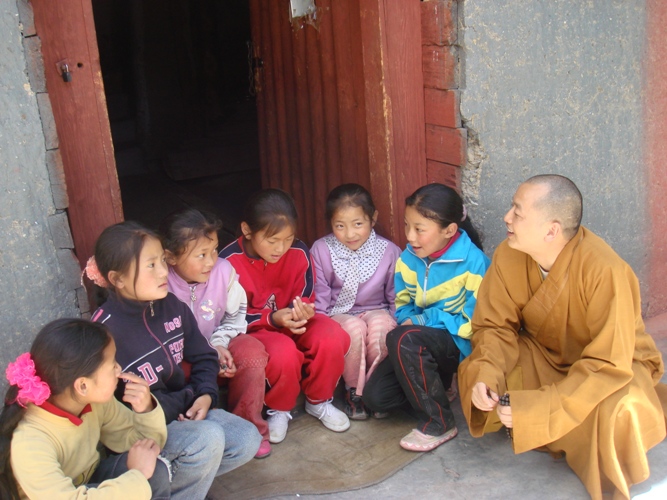道坚法师与部分资助的儿童谈心