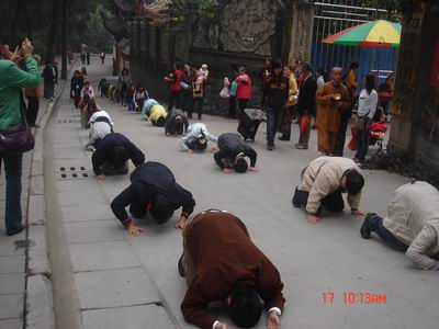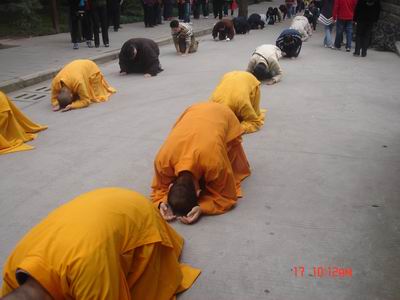 三步一拜,留在身后的,是城市的喧嚣和困惑,红尘的诱惑和迷失;三步一拜,体悟佛的教诲,学习佛的榜样,将汗水纷华为无尽的行愿,点亮我们的心灯,坚毅我们走更远的行程。