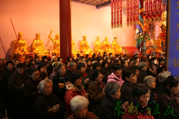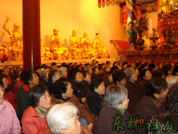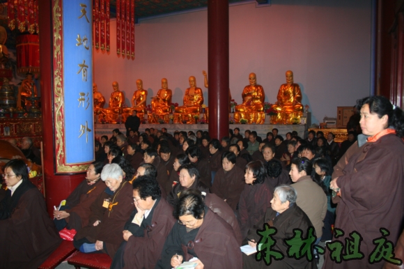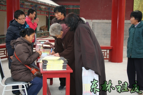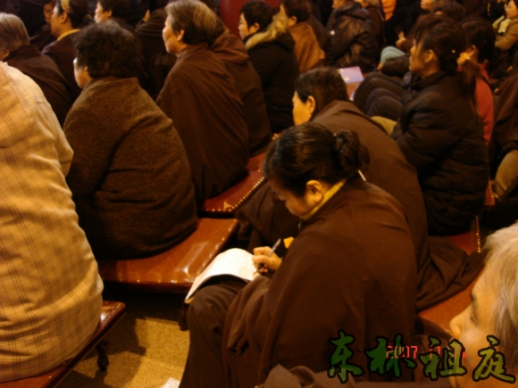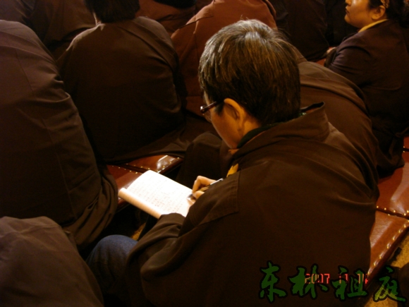 研究生班学员在认真听讲作笔记。 信众们在积极为东林大佛捐款。 |