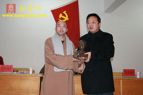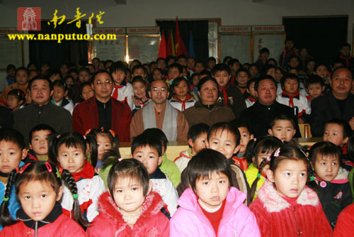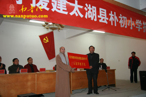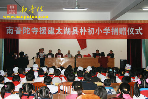28日,正兴法师、果妙法师和安徽省太湖县政协主席、安徽省赵朴初研究会副会长兼秘书长王中华先生及当地政府有关人员、学校师生200多人参加了在寺前镇文化馆举行的“厦门南普陀寺慈善会援建太湖县朴初小学捐赠仪式”,在仪式上,南普陀寺慈善会向太湖县朴初小学捐赠10万元人民币,用于建设朴初小学。
