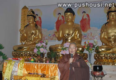 冬天的五台寒风凛冽,下午两点,全寺尼众在法师的引领下列队在新修建门口,恭迎极乐世界清净妙法身阿弥陀佛、万亿紫金身观世音菩萨、 无边光炽身大势至菩萨佛像的到来,声声佛号,片片真心。安放好佛像,法师为大众开示供养佛像的利益。