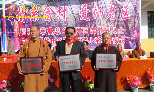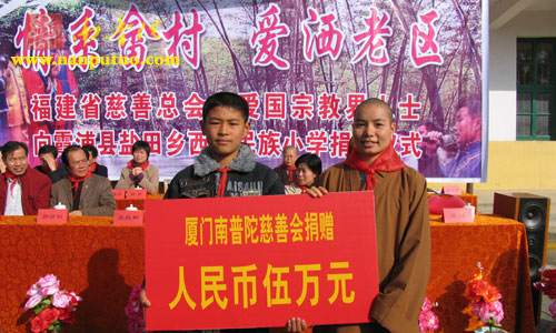 12月27日上午,受厦门南普陀寺慈善会会长圣辉大和尚嘱托,德鸣法师、通灵法师、果瑞法师、静仁法师一行驱车前往福建省霞浦县,参加“情系畲村,爱洒老区——福建省慈善总会、爱国宗教界人士向霞浦县盐田乡西胜民族小学捐款仪式”。此次本会向霞浦西胜民族小学捐赠5万元建校款。