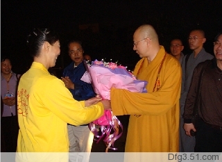 海涛法师抵达阳江凤凰城酒店,下车时接受当地居士献花