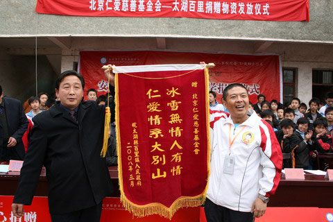 2008年3月30日,仁爱慈善基金会来到了安徽省太湖县下属的北中镇和百里镇发放救灾物资,共计为两地乡民们发放了约35000件衣服和28万斤大米,约有1600户五保户和低保户受惠获得赈灾物品包括大米和衣物。