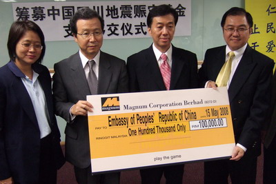2008年5月15日,马来西亚华人公会向中国四川地震灾区捐款仪式在马华公会总部大楼举行,马华公会总会长黄家定、中国驻马来西亚大使程永华、马华公会妇女组署理主席周美芬、马来西亚万能(MAGNUM)集团执行董事林瑞麟及《星报》集团、千百家佛教居士林、马华公会联邦直辖区和雪兰莪州支部妇女组代表等约30人出席。黄家定总会长向程永华大使面交了马华公会总部捐款10万林吉特的支票,马华联邦直辖区和雪兰莪州支部妇女组各捐款1万马币,万能集团和《星报》集团各认捐10万马币,千百家佛教居士林认捐1万马币。