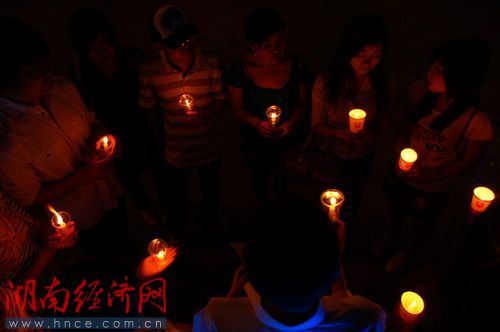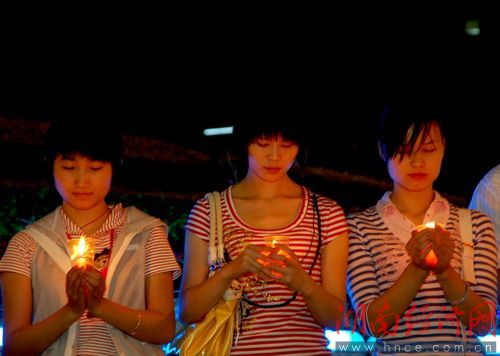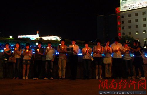5月13日晚8时30分,灯火下的长沙市五一广场,数十名网友自发组织起来,手拿蜡烛在夜幕中为在5.12四川地震中遇难者默哀。
