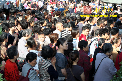 上午7时许,南普陀寺内人潮涌动,香烟缭绕,前来参加浴佛的信众在法师和义工的安排下,静候在大殿两侧,等待浴佛法会的开始。7时30分,寺中钟鼓齐鸣,两序仪仗队幢幡高竖,至法堂迎请方丈则悟大和尚领众浴佛。宝盖威威,大和尚手托太子金身像徐步进入大雄宝殿。唱诵过后,浴佛开始,僧俗二众各个依次出位,在蓝毗尼园前跪拜问讯,手执金匙,盛水浴佛。法会现场,不乏年迈的老人和年幼的孩童,组成了一幕幕感人的画面。大家皆怀着感恩之心浴佛念佛,感恩释尊的无上真理,引导迷惑众生弃暗投明,去秽得净;感恩释尊的清静法雨,令热恼众生得到清凉,获得自在;感恩释尊的甚深佛法,令众生显发自性,同证如來清净法身。